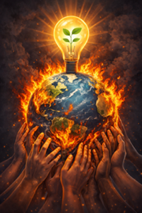 in de wereld om de handen ineen te slaan en de aarde te redden via een morele ambitie die wellicht de laatste strohalm vormt voor ons nageslacht. Op dat sprankje hoop, mooi weergeven via bijgaand AI-plaatje, moeten we massaal onze hoop vestigen, ook al heb ik zelf de laatste tijd via een ingeslopen kort lontje wel eens de neiging om zo maar iemand keihard op z’n bek te slaan, waardoor ik uit veiligheidsoverwegingen ben gestart met een rustgevende mind-sessie die het gemoed wat moet bedaren. De gesprekken gaan immers dagelijks over hetgeen zich in de afglijdende wereld afspeelt, in zo’n versnellende, heftige en destructieve mate die ik niet eerder in mijn toch al vrij lange leven heb gesignaleerd.